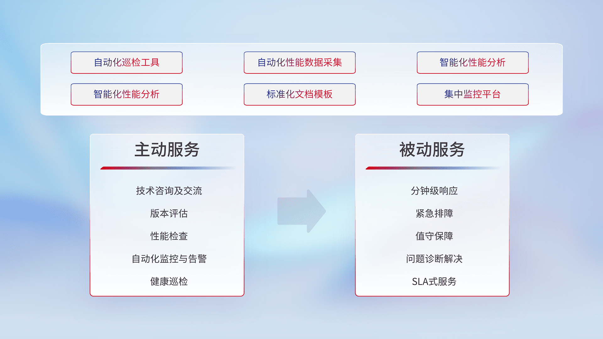 智能化工具和标准化文档,,,,保障服务质量,,,,提供主动服务(包含技术咨询、、、版本评估、、、、性能检查、、、、自动化监控与告警、、、健康巡检)和被动服务包含(分钟级响应、、、紧急排障、、、值守保障、、、问题诊断解决、、、SLA服务)。。。。